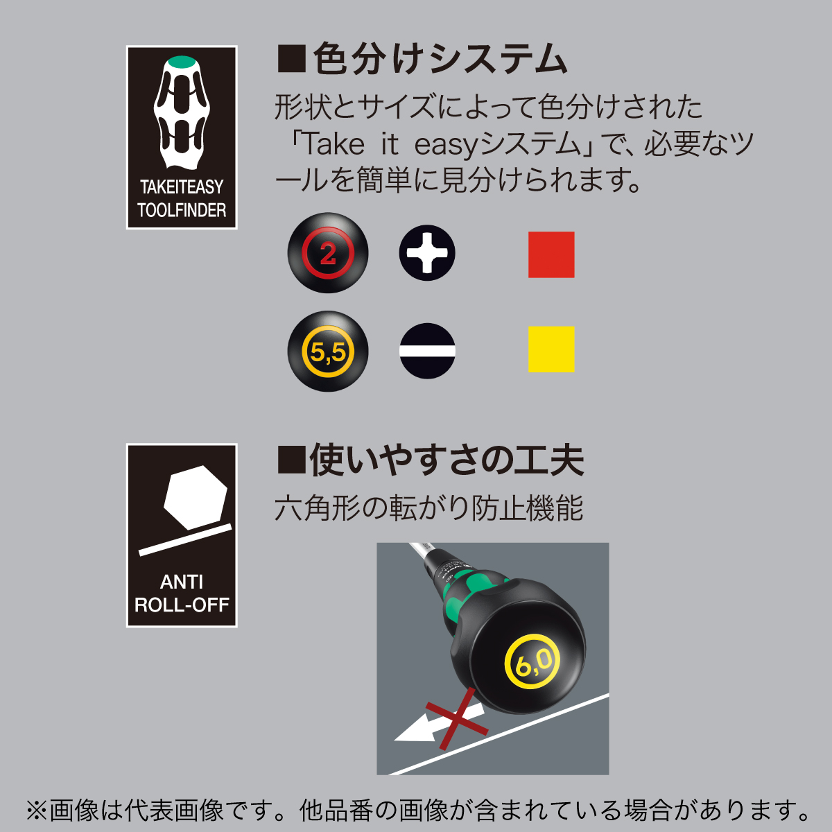 ・形状とサイズによって色分けされた「Take it easyシステム」で、