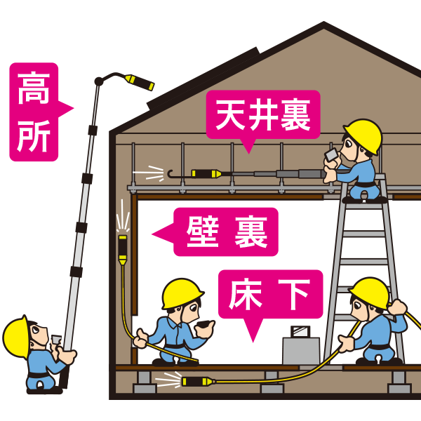 Wi-Fi接続でリアルタイム映像を見られるため、その場で状態を判断して作業計画を立てられます。高所作業のリスクを減らしながら、コストダウンも実現できる優秀な工具です。そのほかにも呼線やジョイント式ロッドにつけることで、天井裏や床下など人の手が届かない場所へも送り込んで映像を見ることができます。もちろん録画もOK。画質もきれいです。