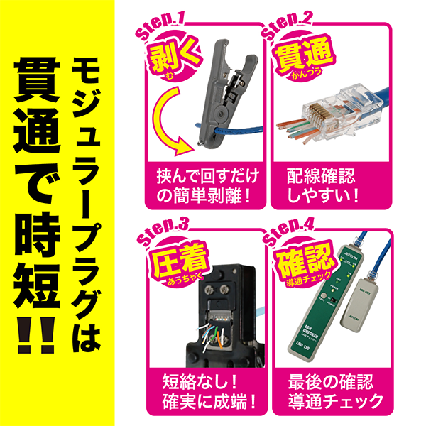 そんな時には「貫通タイプのモジュラープラグと圧着工具 LMJ-8TC」が便利です。